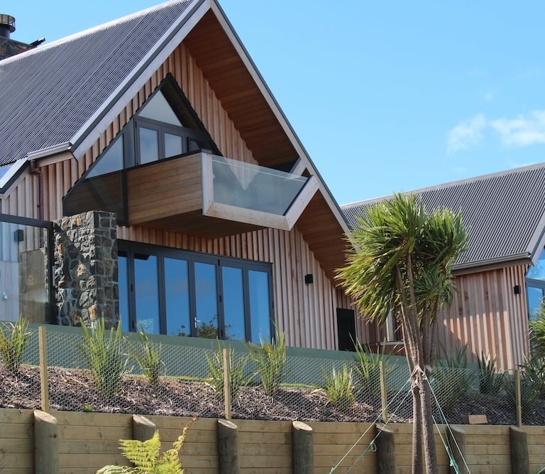 Type of construction: Polished coloured concrete slab with paua shell, cedar board and batten cladding over timber framing. Solid natural stone fireplaces and polished concrete in-situ kitchen benches.